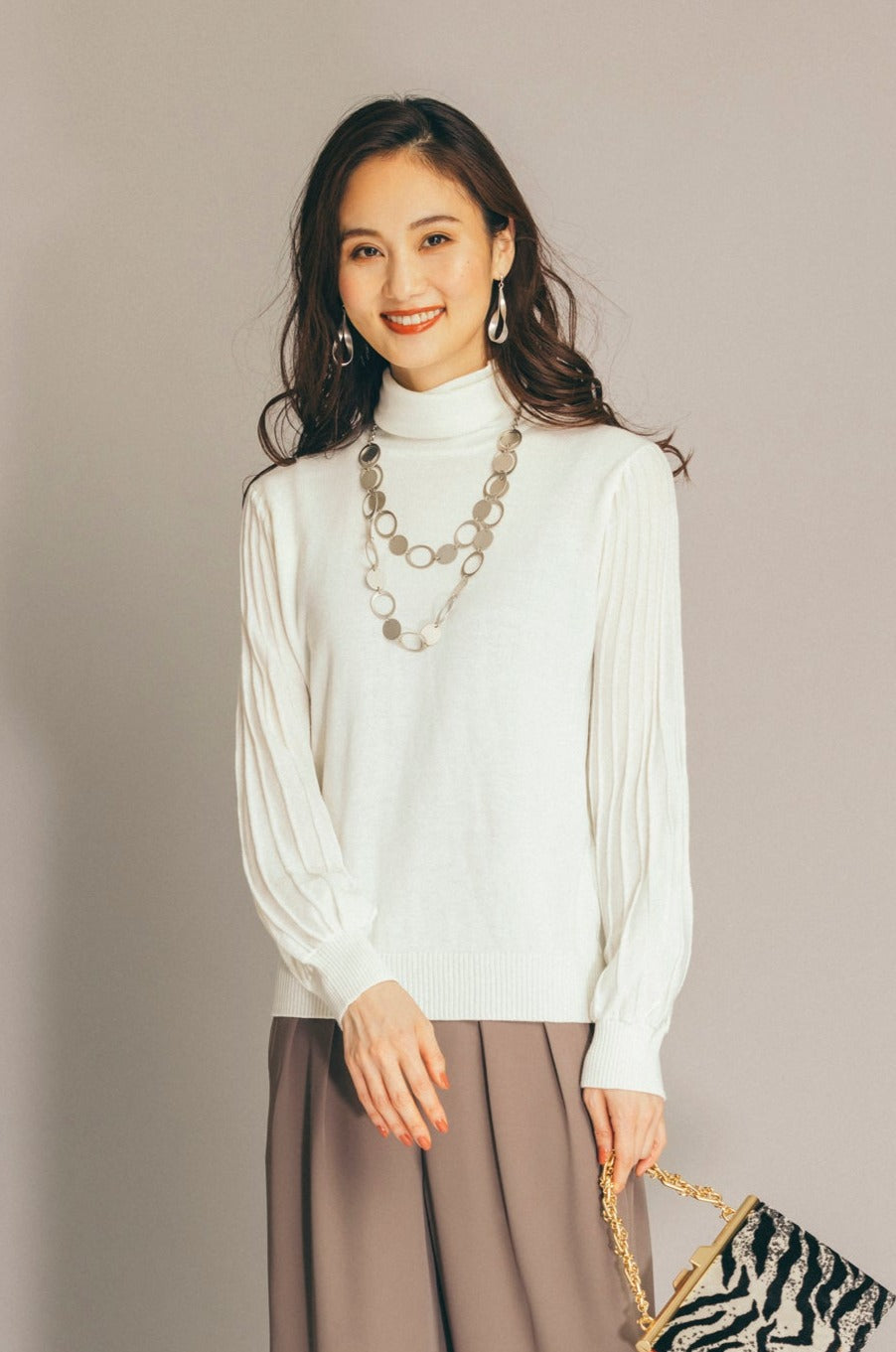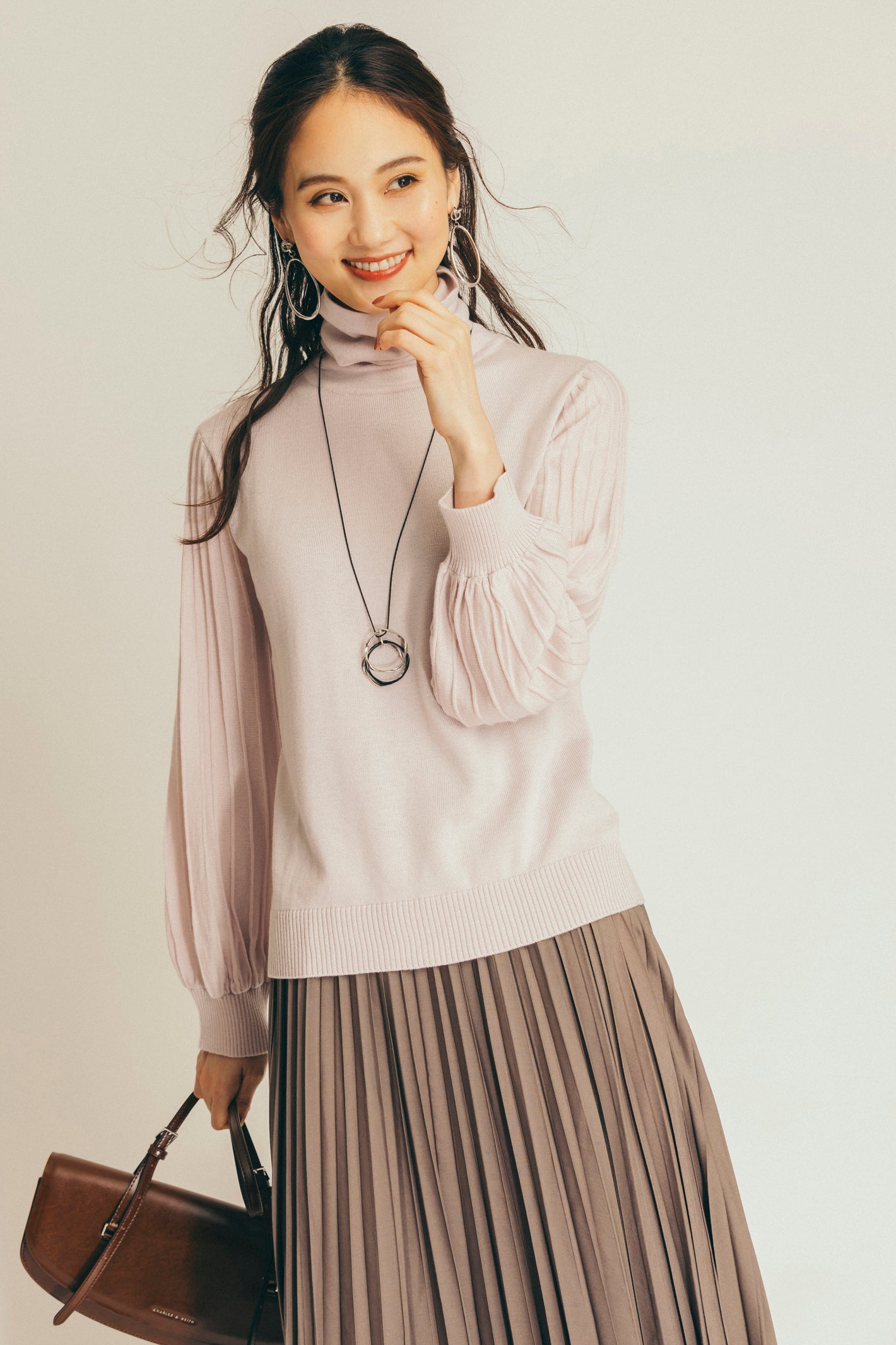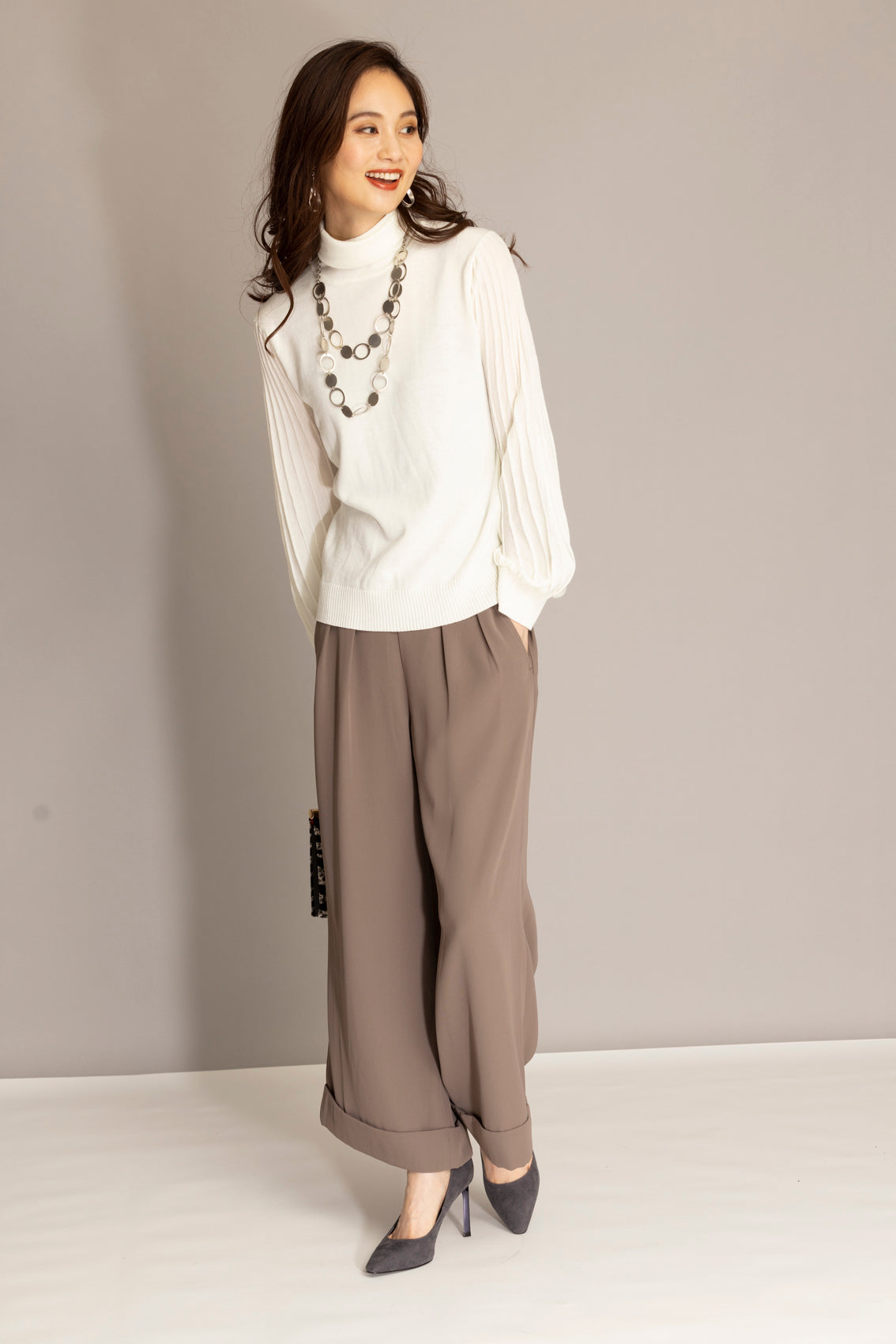 プリーツは上下で種類が異なり、凝ったディテールが光ります。